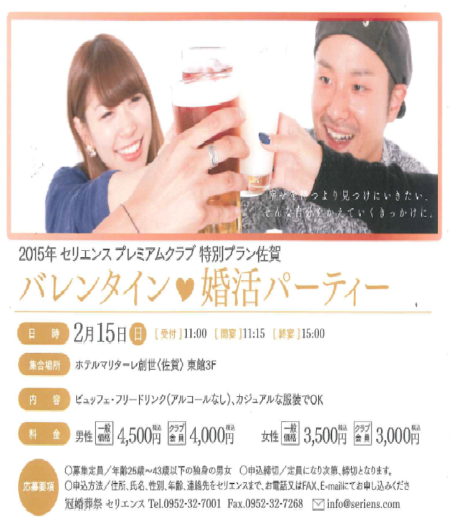 2015年セリエンヌプレミアムクラブ特別プラン佐賀 バレンタイン婚活パーティー【主催:(株)平安閣 NPO互助会 セリエンヌ】