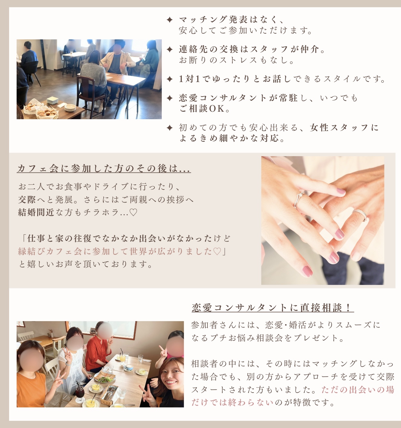 《スケジュール》 ⚫︎ 16:45〜 受付・プロフィールシートのご記入 (お席でゆっくりご記入いただけます) ⚫︎ 17:00〜 縁結びカフェ会スタート ⚫︎ 17:05〜 1対1での自己紹介タイム (全員と順番にお話しできます) ⚫︎ 18:00〜 お席替え ⚫︎ 18:05〜 軽食を楽しみながら、グループトーク (自然な会話を大切にしています) ⚫︎ 18:45〜 連絡先交換をご希望の方のご記入 +簡単な感想アンケート ⚫︎ 〜19:00 解散 ※当日の雰囲気や進行状況により、 お時間が前後する場合がございます。あらかじめご了承ください |